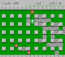 Como ven, los laberintos se conforman de bloques de concreto, que no se destruyen con las bombas, y de ladrillos, a los que sí podemos hacer volar a bombazos. Y claro, los infaltables enemigos que andan dando vueltas por ahí con menos inteligencia artificial que un cerebro de plástico. Me parece que sus movimientos también son aleatorios… al menos los de los «globos» que se ven en la imagen.