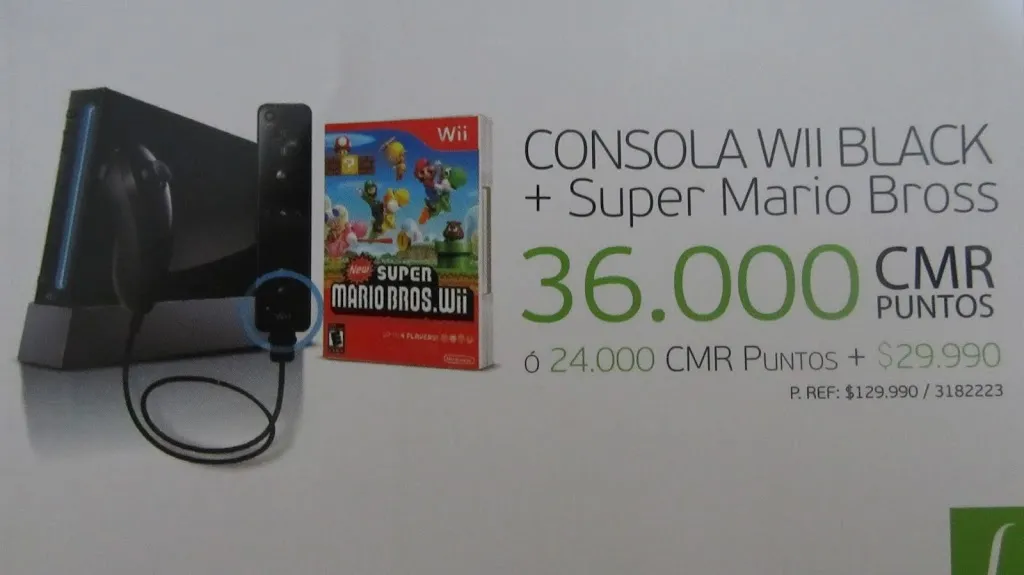 Hace algún tiempo me llegó una carta. Bueno, no era una carta, sino más bien propaganda spam en papel. Era un pequeño folleto de la multitienda Falabella donde me informaban de sus ofertas de fin de año, y de un súper crédito de muchos millones de pesos para comprar lo que quisiera… en fin, ustedes saben el cuento. El tema es que en ese informativo venía una promoción más o menos interesante: podía canjear mis puntos Falabella por una Wii Black y el juego New Super Mario Bros. Wii, tal como pueden ver en la siguiente imagen.