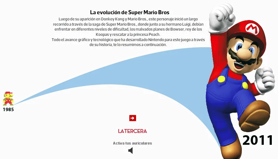 Lo siguiente que quiero contarles es sobre una animación flash bien interesante que compartió conmigo una compañera de trabajo, Verónica Reyes. Se trata de una cronología que muestra de manera bastante fidedigna la historia de la saga Mario. Aunque no es un documental -y a pesar de que faltan algunos juegos-, es muy interesante la manera en cómo presentan la información, ya que la animación es interactiva. Fue preparada por el diario La Tercera, de Chile, y pueden verlo pinchando en la imagen de abajo[1].